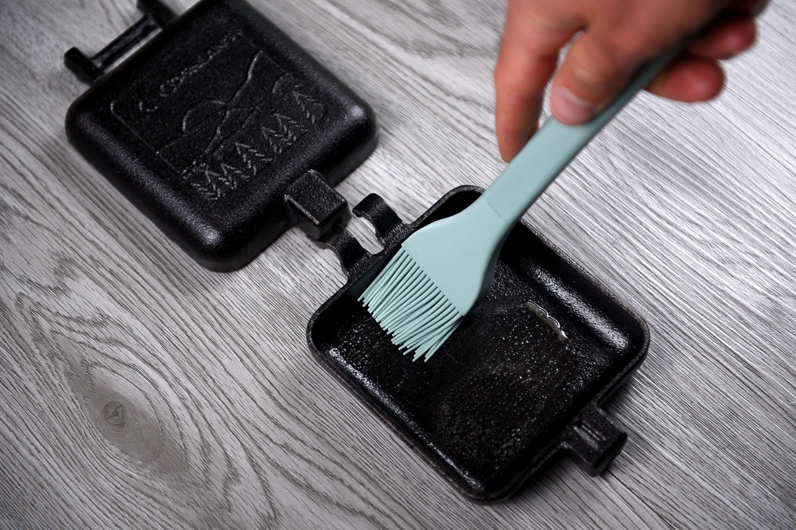 With the cast iron plates separated, use a high smoke point oil such as canola or vegetable oil and evenly spread it on the entire cast iron surface. You don't need to drench it with oil, just apply enough of a coating to form a solid base layer.