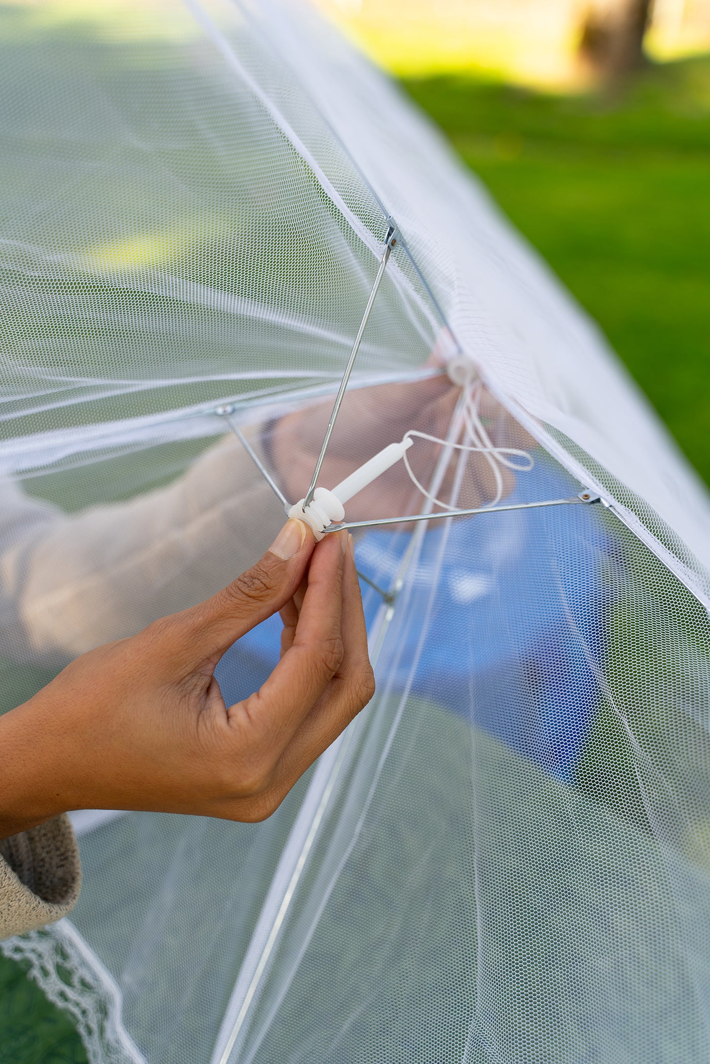- Metal frame opens like an umbrella and holds its shape