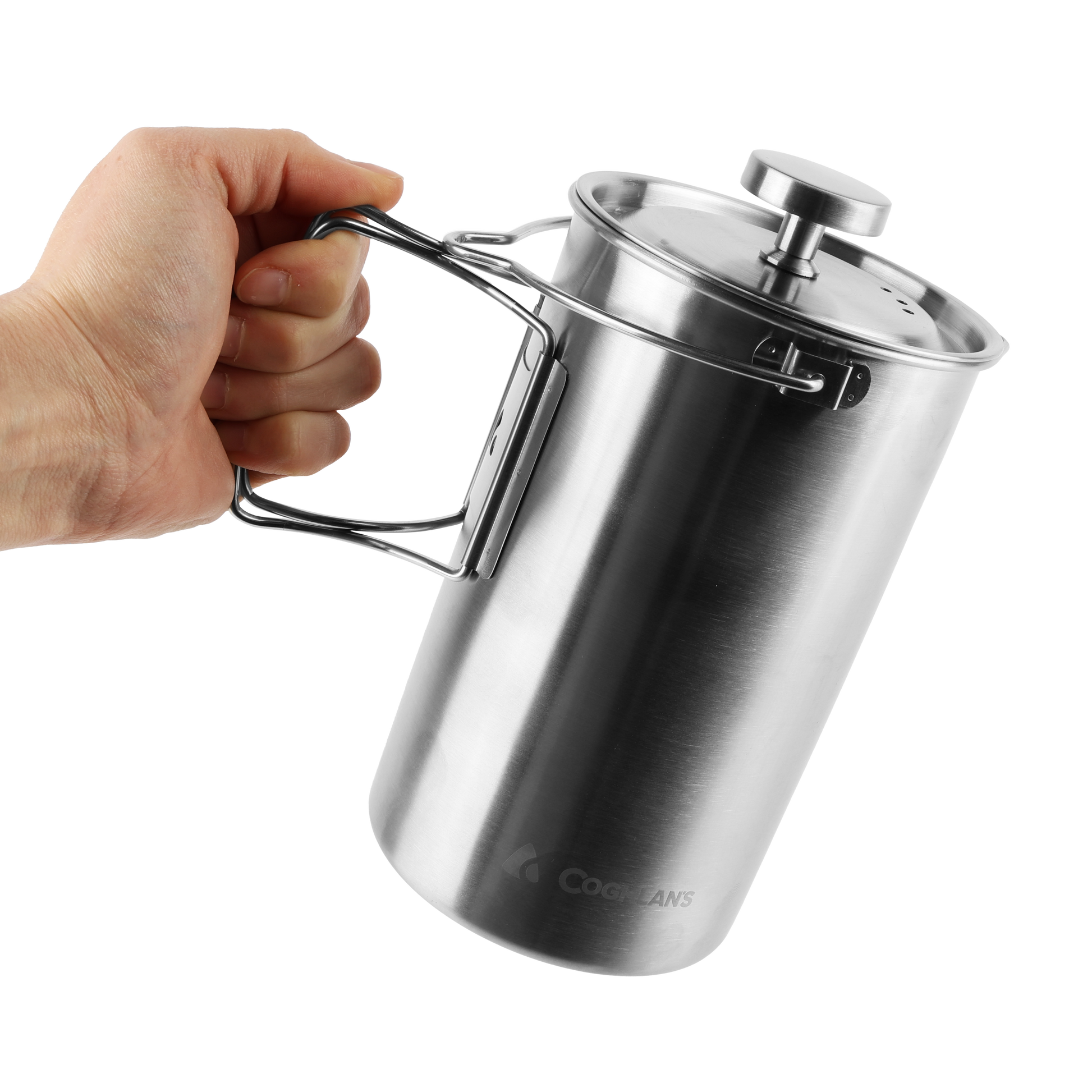 Wake up to better coffee right at camp. This rugged stainless steel French Press brews bold, smooth coffee wherever your adventure takes you. Made from high-quality 304 stainless steel, it's built to go straight over an open flame or camp stove – no extra gear required. With a 32 oz. (4-cup) capacity, it's perfect for solo mornings or sharing with your crew. The fine mesh plunger makes for a clean pour every time, while the fold-away handles make it easy to pack and pour. Don't forget the precision spout to help avoid messy drips. Tough, portable, and dishwasher safe, it's fresh, hot coffee made simple. (Just a heads-up: the handle can get hot, so use gloves or a cloth when it’s been on the heat.)